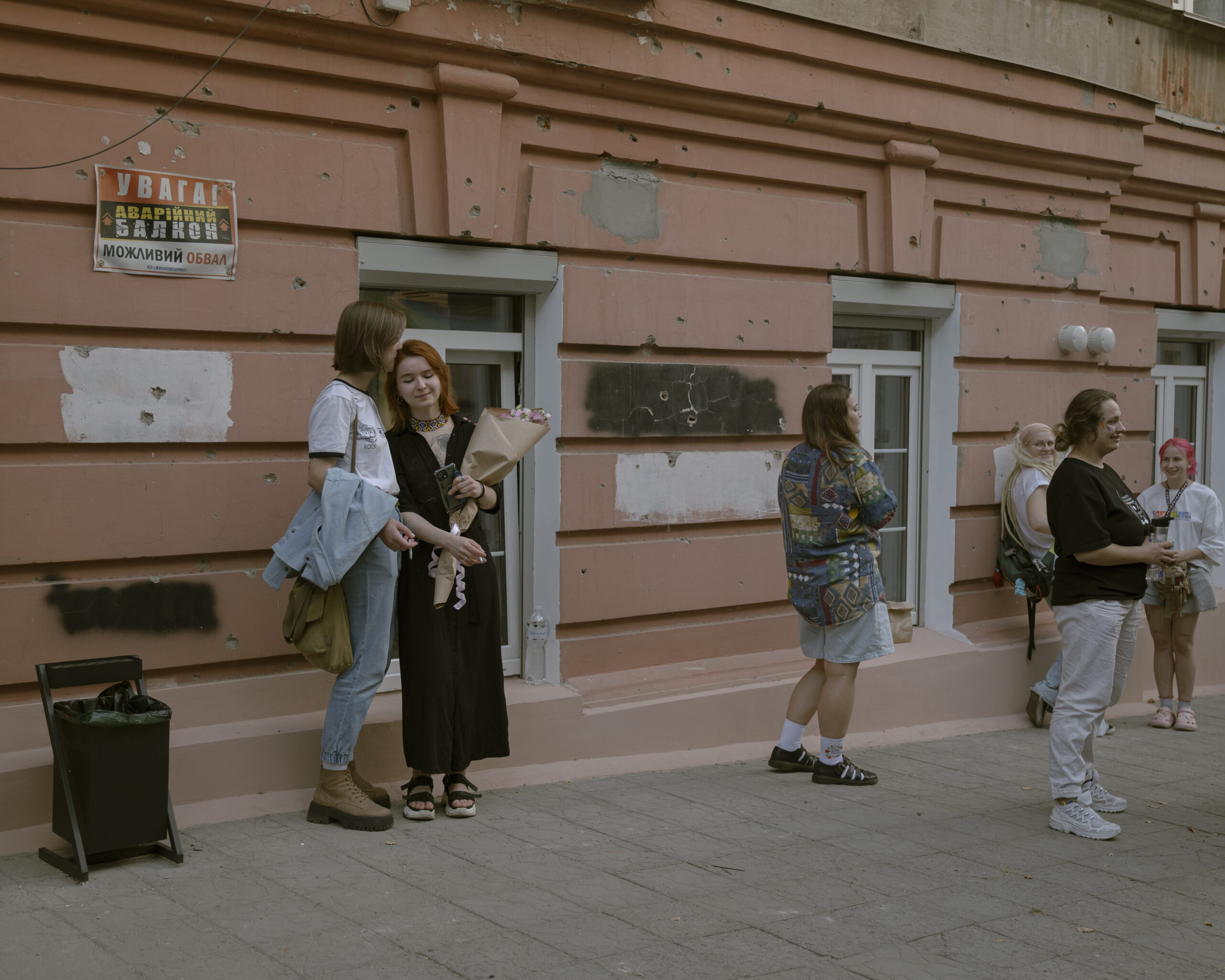 Auf dem zweiten Bild sehen wir Teilnehmerinnen eine Pride-Veranstaltung in Charkiw. Die Fassade im Hintergrund trägt Spuren von Geschossen. Ein Pride mitten im Krieg, wie passt das zusammen?