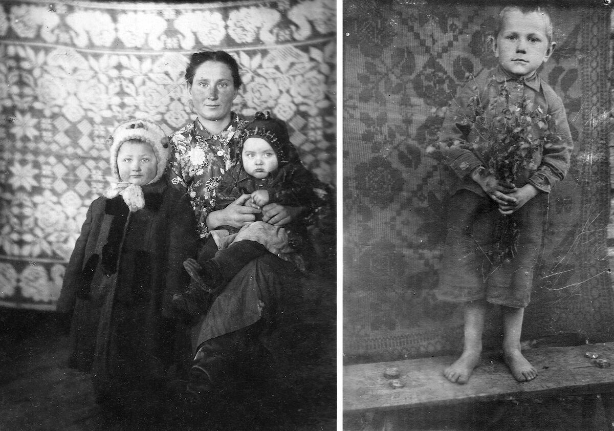 Rechts: 1950-1952, Dorf Puhatschy, Waloshynski Rajon, Minskaja Woblasz. Privatarchiv Dsmitry Sjarebranikau. / Fotos © VEHA-Archiv, Sammlung Najlepšy bok