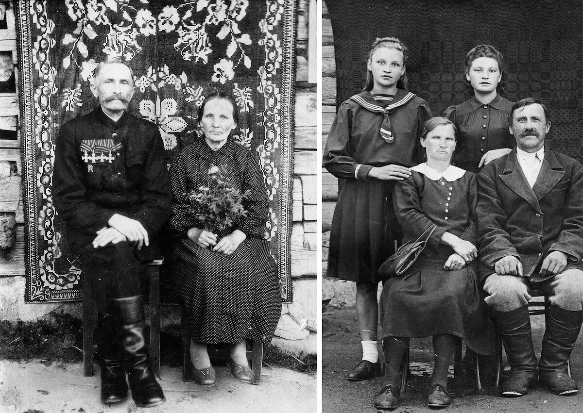 Die Tradition, Teppiche als Wanddekoration aufzuhängen, entstand im ländlichen Belarus, vor allem zwischen den Kriegen und nach dem Zweiten Weltkrieg. Die meisten Fotos in unserer Sammlung Najlepšy bok wurden in Dörfern aufgenommen, oft von fahrenden Fotografen, die Webteppiche mit sich führten, um ein einfaches, mobiles Fotoatelier aufzubauen. Sie dienten als Hintergrund für Familienporträts, ähnlich wie die Kulissen in städtischen Ateliers.