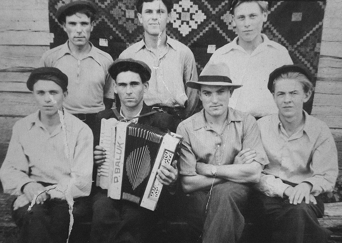 1952-1953, Dorf Kanjuchi, Pinski Rajon, Breszkaja Woblasz. Valjanzina Marwenjuks Ehemann mit Freunden. Quelle: Belarussisches Oral History Archiv. / Foto © VEHA-Archiv, Sammlung Najlepšy bok