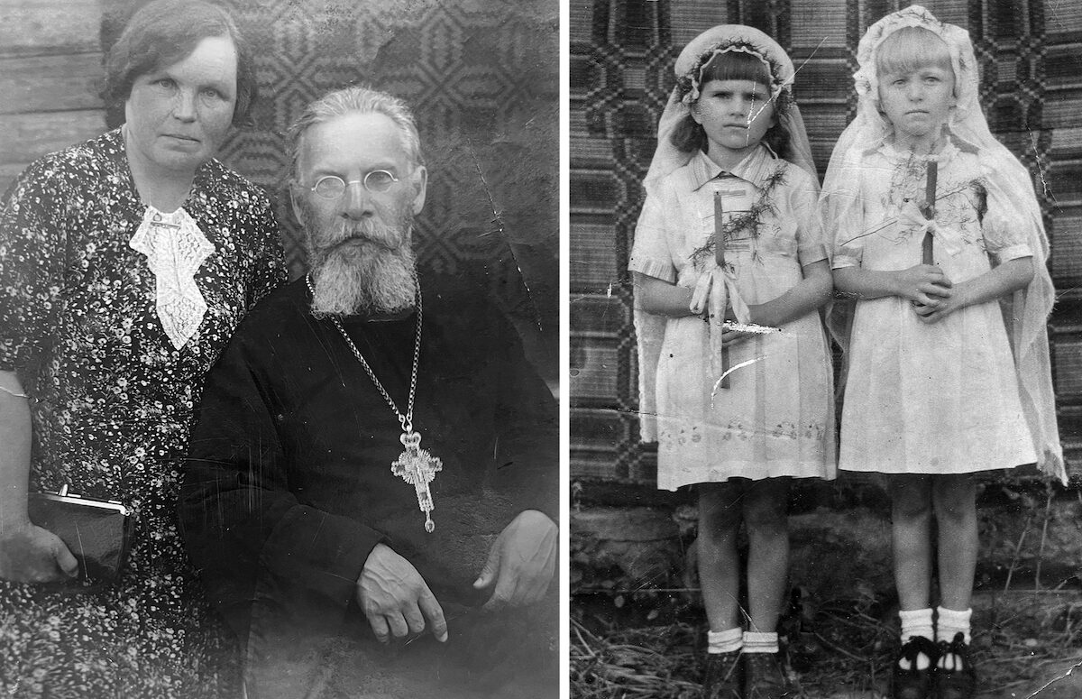 Links: Um1950, Dorf Aharodniki, Lidski Rajon, Hrodsenskaja Woblasz. Priester Boris Shabrouski der Pryabrashenskai Kirche mit seiner Frau. Privatarchiv Vera Tyschkewitsch.