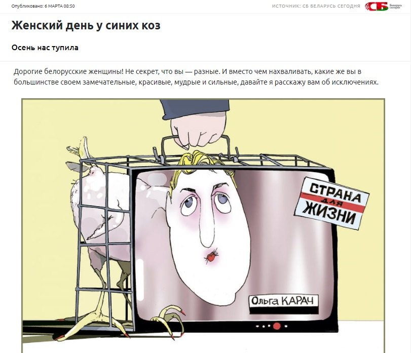 „Der Frauentag bei den Blauziegen / Der Herbst hat uns verblödet / Liebe belarussische Frauen! Es ist kein Geheimnis – ihr seid verschieden. Und anstatt nun Lobeshymnen anzustimmen, wie wundervoll, schön, klug und stark ihr doch in der Mehrzahl seid, möchte ich heute lieber über die Ausnahmen sprechen.“ Im Bild ist der Name Olga Karatsch eingeblendet sowie das Logo des Youtube-Kanals Ein Land zum Leben.