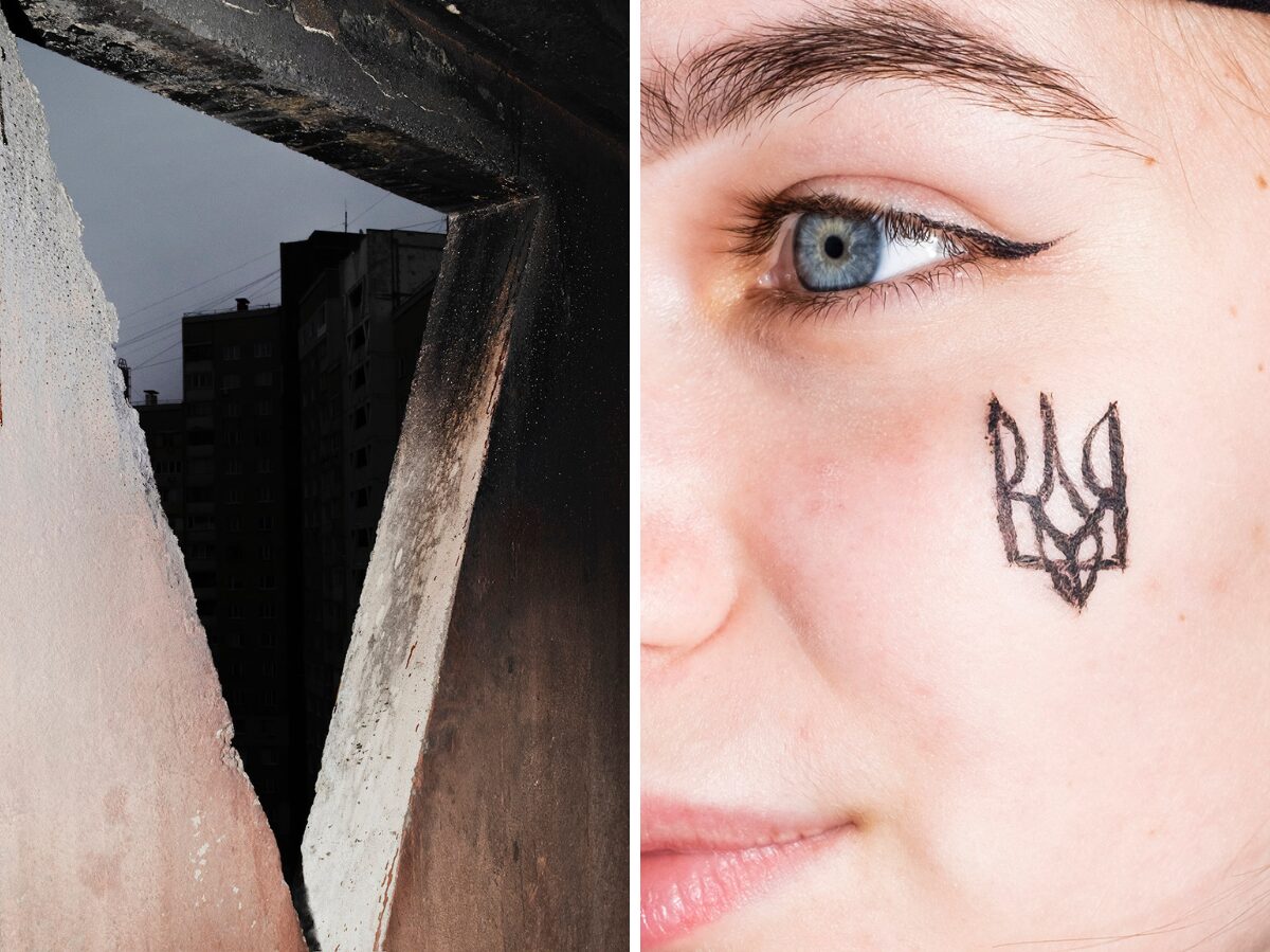 dekoder: Ein verrußtes Gebäude und eine junge Frau mit dem Wappen der Ukraine auf der Wange – was verbindet diese beiden Bilder?