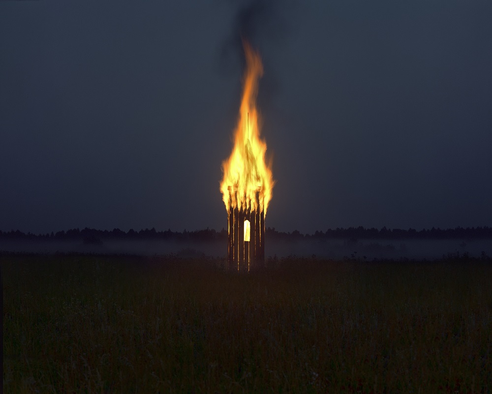 Dieser Tkachenko ist einfach genial. Seit Malewitsch hat niemand mehr so meisterhaft mit dem russischen Raum zu arbeiten vermocht. Tkachenkos Inbrandsetzung eines Dorfes ist ein enorm tiefsitzender Archetypus: von Brandrodung bis zum Brand von Moskau 1812, von Pugatschow bis Chowanski, von Nikolai Polisskis Land Art bis zu den letzten Aktionen Pjotr Pawlenskis – doch der direkte Vergleich ist für mich das Schwarze Quadrat.