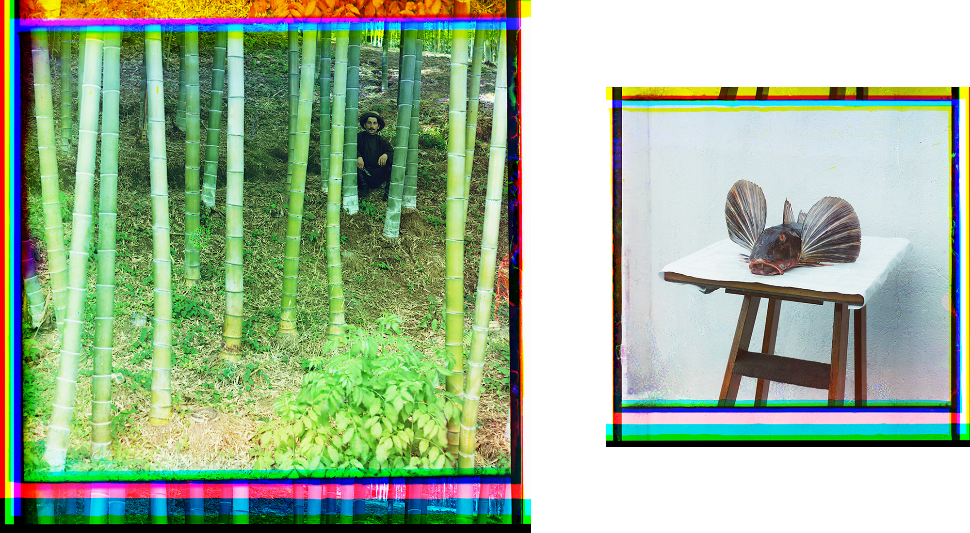 Diese additive Dreifarben-Fotografie bringt einige Besonderheiten mit sich, so scheint etwa ein bewegtes Objekt in verschiedenen Farben zu schillern – unten in der Fotoserie zu sehen beim Wasser auf dem Bild des Schleusenwärters Karlinski oder auch beim Gesicht eines der Besatzungsmitglieder des Dampfschiffs Scheksna. Hier finden sich weitere technische Details zu dieser längst vergessenen Fotografier-Methode.