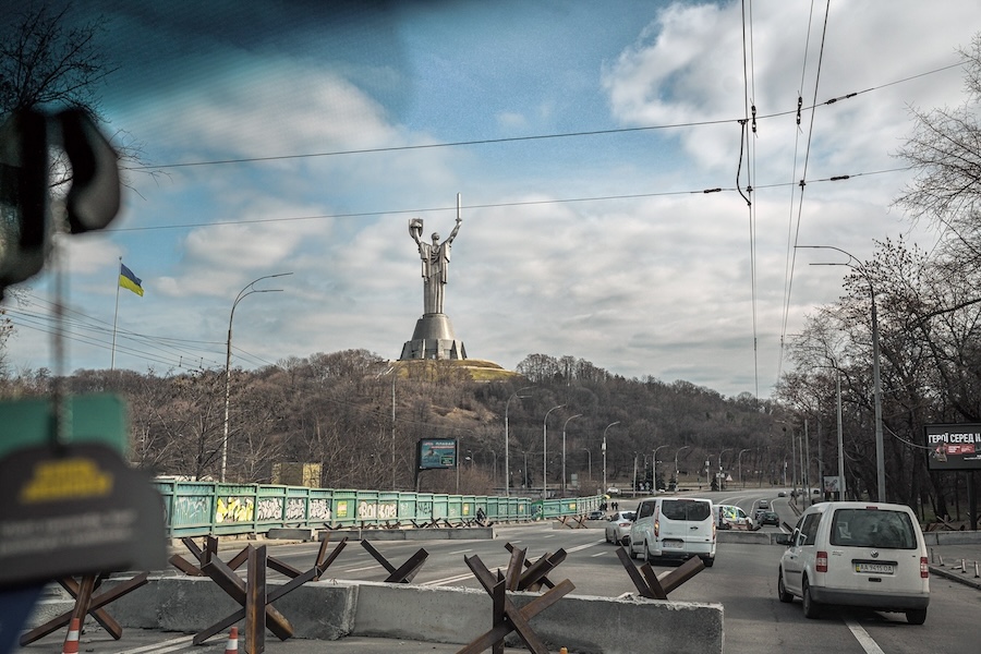 Panzersperren vor der „Mutter Ukraine“ in Kyjiw. Die Statue wurde 1981 in der Sowjetunion als „Mutter Heimat“ errichtet und 2023 umbenannt / Foto: © IMAGO, EST&OST