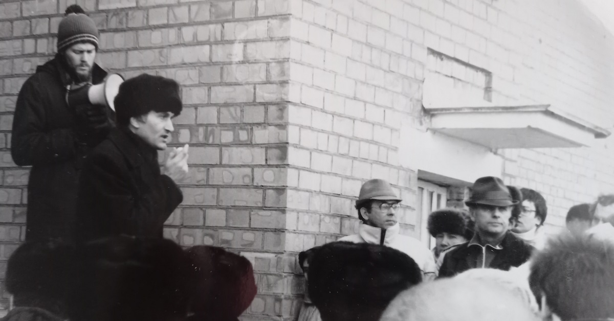 Yury Drakakhrust (links mit Megaphon) und BNF-Boss Sjanon Pasnjak bei einer Kundgebung in Minsk im Februar 1990 / Foto © privat
