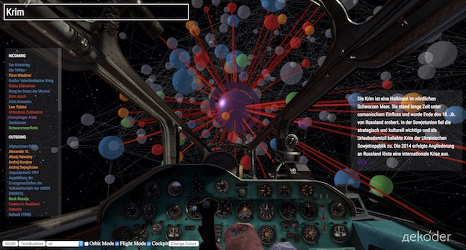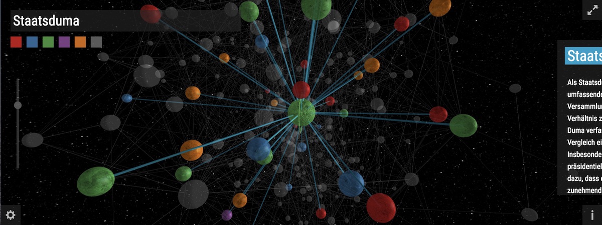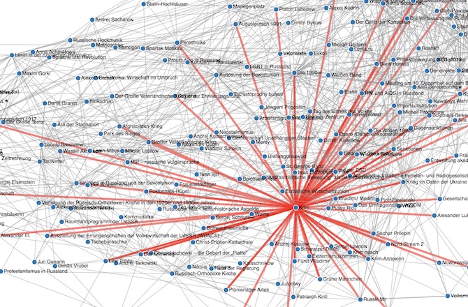 Es war von Anfang an Teil von Martins dekoder-Vision, dass unsere Plattform nicht nur Hintergrundkompetenzen und aktuelle Artikel liefern sollte, sondern auch die Bezüge zwischen diesen Inhalten zeigen – das, so sein Ansatz, wäre mindestens ebenso wichtig, um Russland zu entschlüsseln. In seiner Idealvorstellung vom Gnosmos, dem „Kosmos der Gnosen“, sollte es eine grafische Darstellung dieser Bezüge geben, die sich automatisch aktualisiert und durch die der User in einer dynamischen Art und Weise hindurchnavigieren kann.