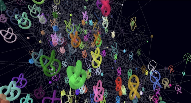 Mit dem obigen Spinnennetz war ich der Sache nun ein entscheidendes Stück näher gekommen. Also beschloss ich, diese Fährte wieder aufzunehmen, was mich – der ich eigentlich gar kein Programmierer bin, sondern studierter Philosoph – vor einige Herausforderungen stellte. Zum Beispiel sollte sich, dachte ich mir, die Größe der Knotenpunkte nach der Anzahl ihrer Verlinkungen richten, man bräuchte farblich unterschiedene Kategorien, eine Suchfunktion, Vorschau-Texte, und natürlich sollte das Ganze am Besten noch in 3D sein.