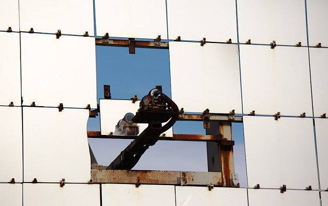 62 bewegliche Heliostaten bündeln das Sonnenlicht auf einem Versuchstisch – in kürzester Zeit steigt die Temperatur auf über 3000 Grad Celsius