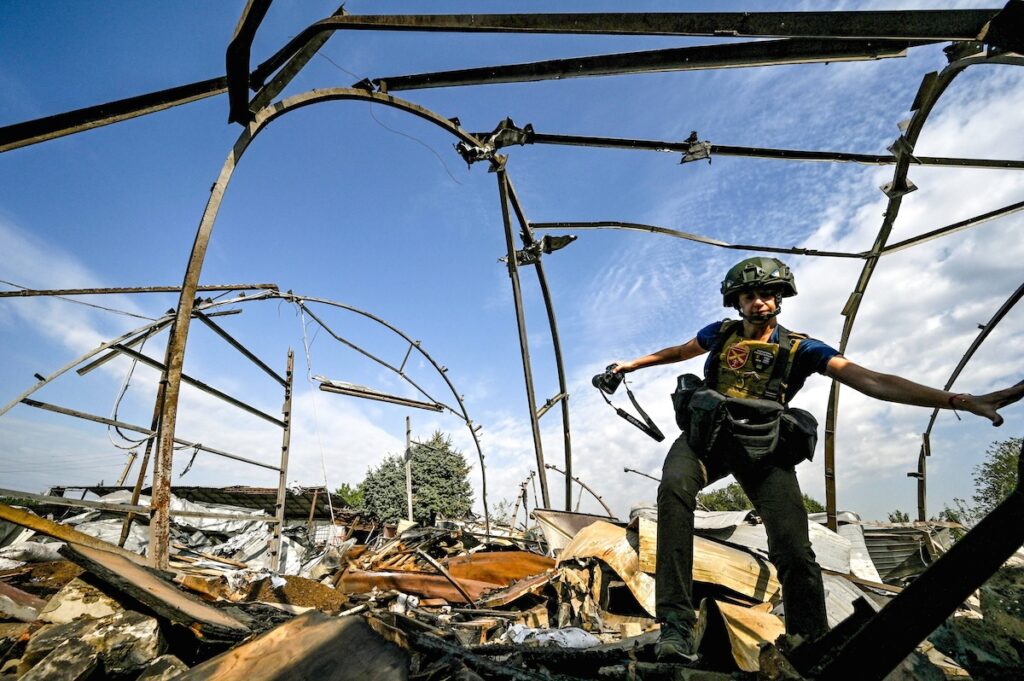Ein Journalist dokumentiert die Zerstörung eines Landwirtschaftsbetriebs durch russische Angriffstruppen bei Orichiw, Region Saporishshja, im September 2023. / Foto © Dmytro Smolienko/ Ukrinform/ Imago
