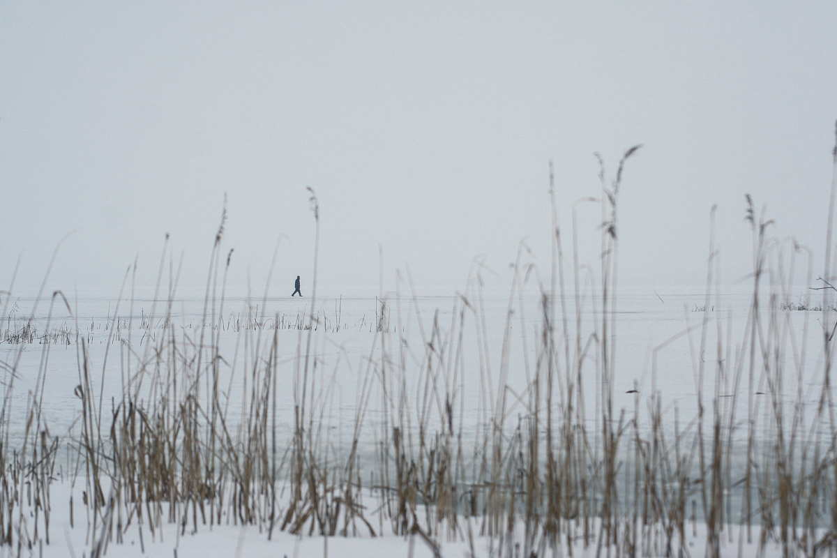 Ein Mann läuft über den gefrorenen Aswejasee im Norden von Belarus / Foto © Siarhei Hudzilin