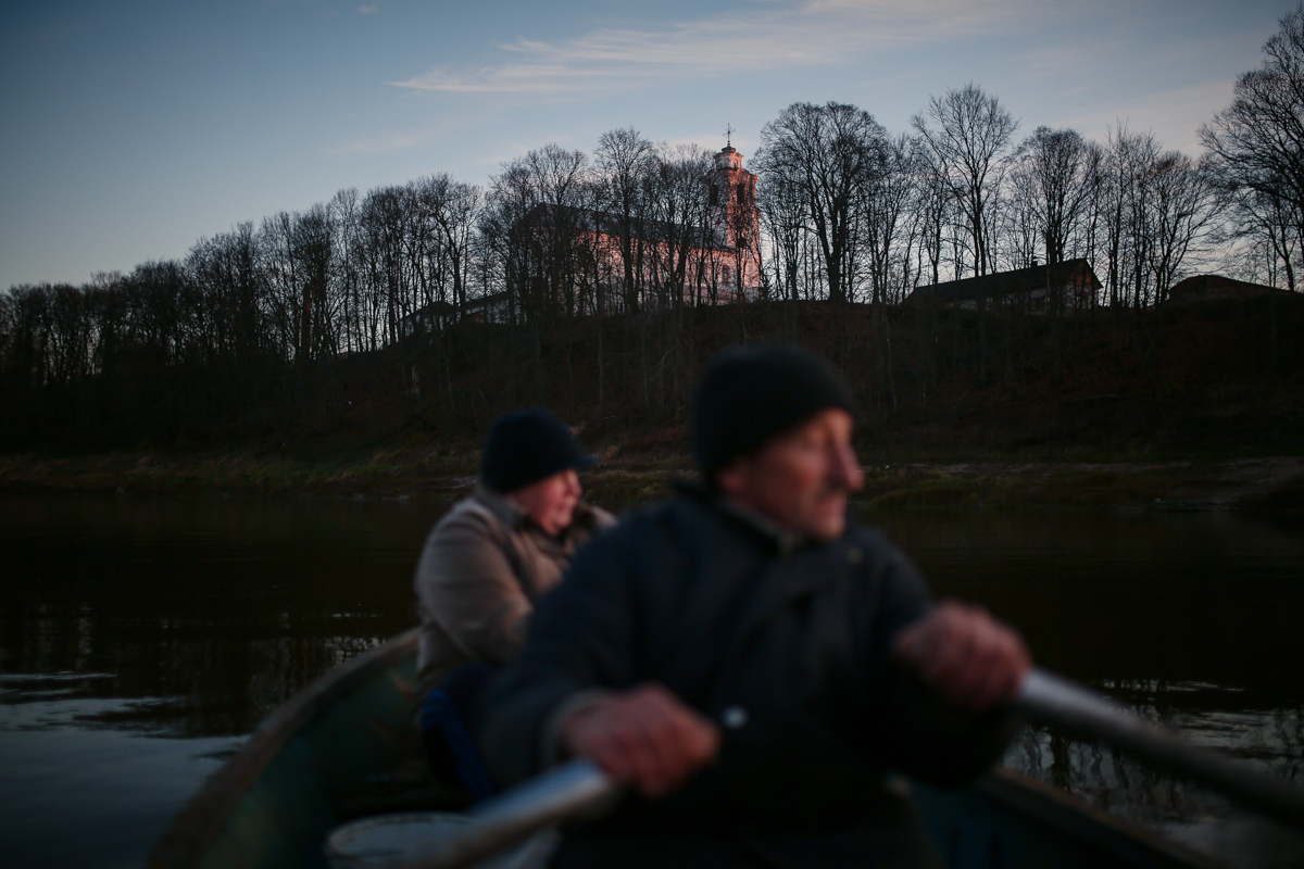 Bewohner von Druja – ein Agrogorodok im Norden an der Grenze zu Lettland – setzen über den Grenzfluss Dswina zu einer Insel über, auf der sie ihre Kühe weiden lassen … / Foto © Siarhei Hudzilin