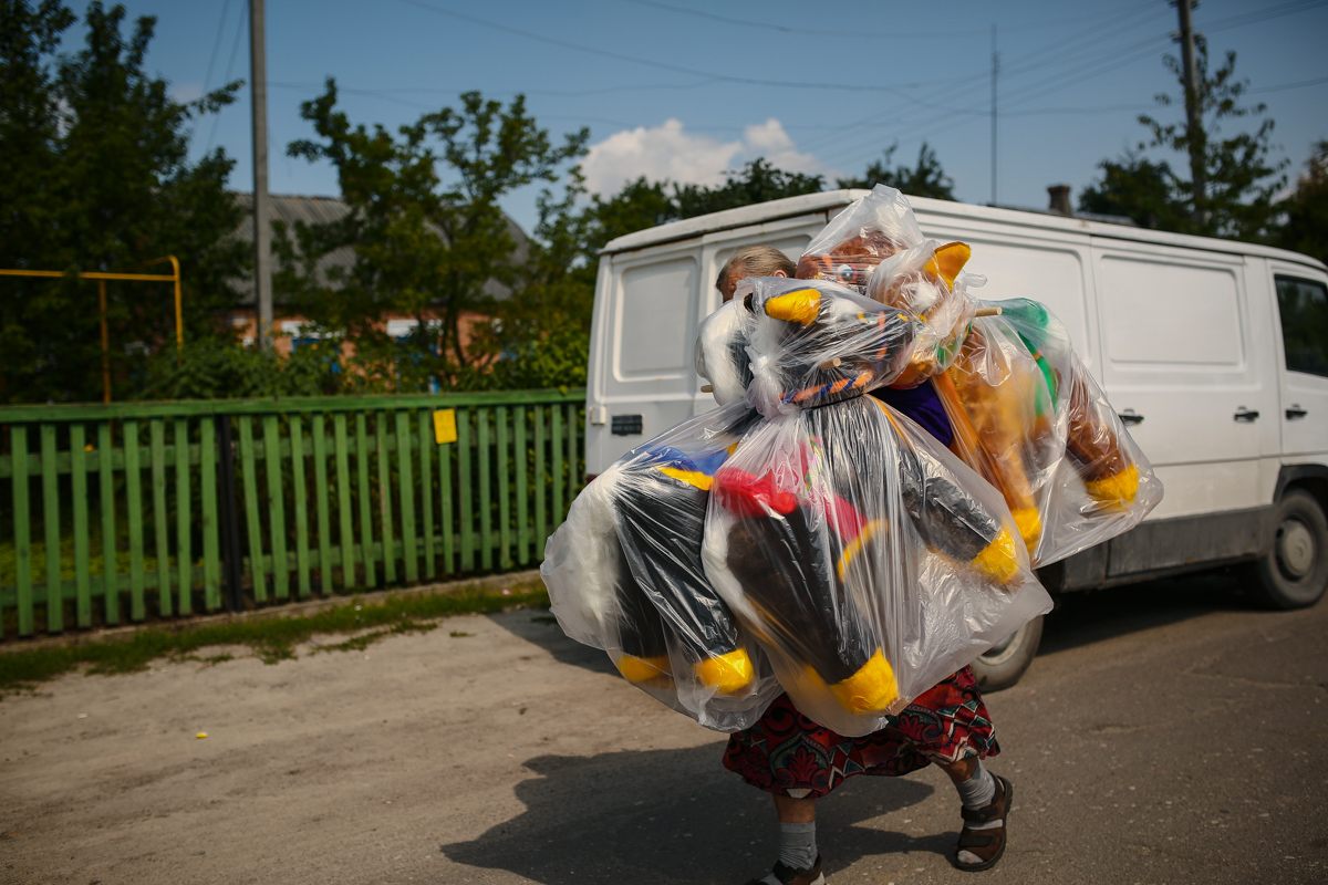 Stofftiere in Plastiktüten sind das Handelsgut einer Frau, die im Dorf Retschyza an der Grenze zur Ukraine (Woblasz Gomel) zum Bahnhof eilt. Dort stoppen international verkehrende Züge, und der Verkauf von Waren an die Passagiere ist für Einheimische eine Möglichkeit, Geld zu verdienen / Foto © Siarhei Hudzilin
