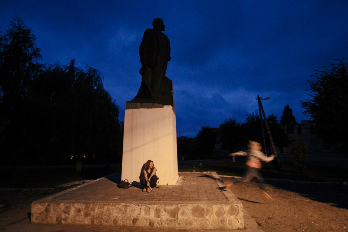 In den Abendstunden sitzt eine junge Frau im Zentrum der Stadt Wyssokaje vor einer Lenin-Statue. Wyssokaje ist der am weitesten westlich liegende Ort des Landes / Foto © Siarhei Hudzilin