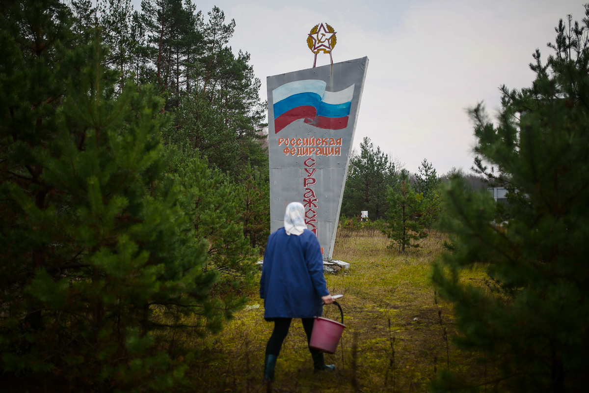 Im Wald nahe Chozimsk sammelt eine Frau Pilze und passiert den Grenzstein zwischen Belarus und Russland. Die Grenze existiert nur formell, ohne Grenzposten oder -kontrollen / Foto © Siarhei Hudzilin