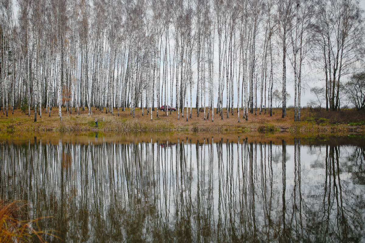 Ein angelnder Mann nahe dem Dorf Schaladonauka. Sein Auto hat er hinter sich inmitten der Birken abgestellt / Foto © Siarhei Hudzilin