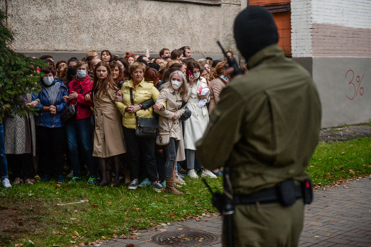 Die Menschen hatten sich zunächst auf dem Platz beim Komarowski Markt versammelt – genau dort hatte am 12. August die erste Frauendemonstration stattgefunden. Gleich zu Beginn wurden ungefähr zehn Menschen verhaftet. Dann lief die Menge ins Stadtzentrum, zum Prospekt Nesawisimosti. Sie lief durch enge Straßen, weswegen sich die rund tausend Menschen starke Kolonne zu einer 500 Meter langen, schmalen Kette zog. Plötzlich kamen Busse ohne Nummernschilder mit Silowiki, die anfingen Menschen festzunehmen. Ein paar versuchten wegzurennen, den Rest drängte man am Zaun der ehemaligen Fabrik Horizont zu engstehenden Gruppen zusammen. Eine dieser Gruppen habe ich fotografiert.