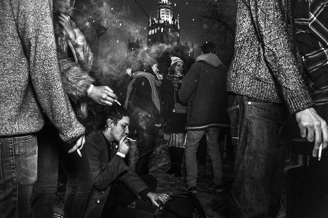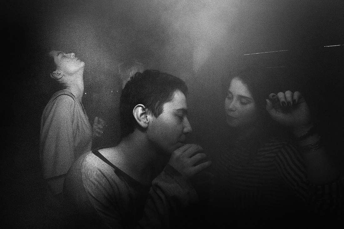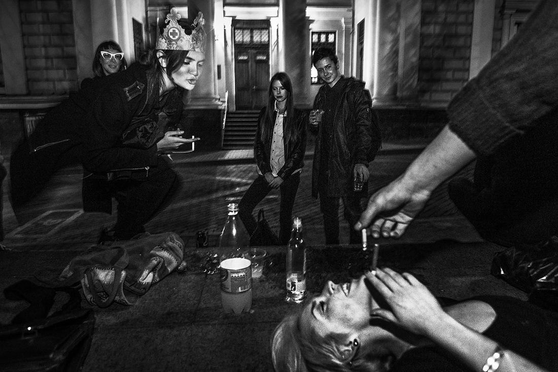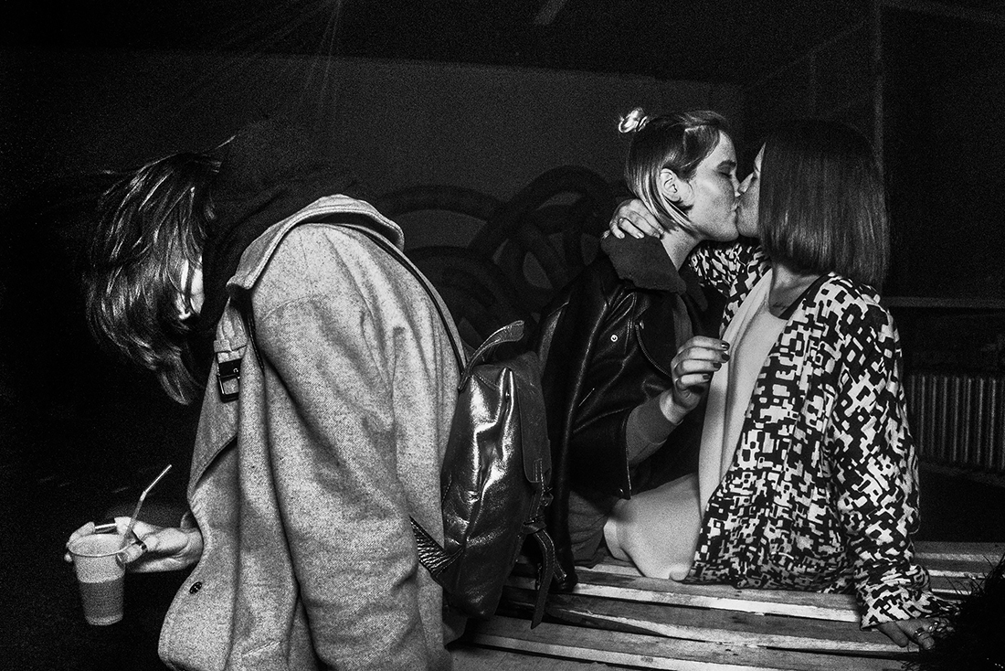 In manchem erinnern Vebers Fotos an die Arbeiten des russischen Großmeisters der Dokumentarfotografie Igor Mukhin, der auch sein Lehrer an der renommierten Rodtschenko-Schule für Fotografie und Multimedia in Moskau war. Mukhin wurde bereits in den 90ern durch seine Arbeit mit Rockmusikern zu einem Chronisten des Moskauer Nachtlebens. Was hat sich seitdem verändert? Bei einigen Aufnahmen Vebers fragt man sich für einen Augenblick, in welchem Jahrzehnt, ja in welchem Jahrtausend man sich überhaupt befindet. Feiert die Jugend nicht immer und überall irgendwie gleich?