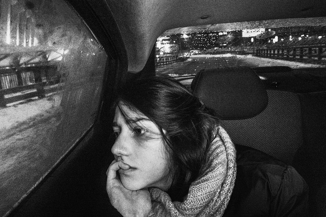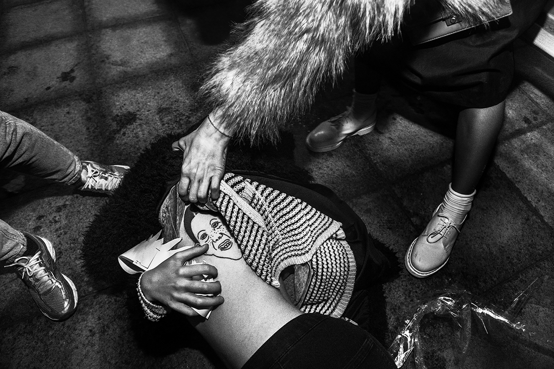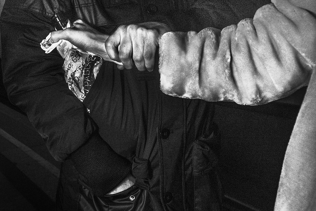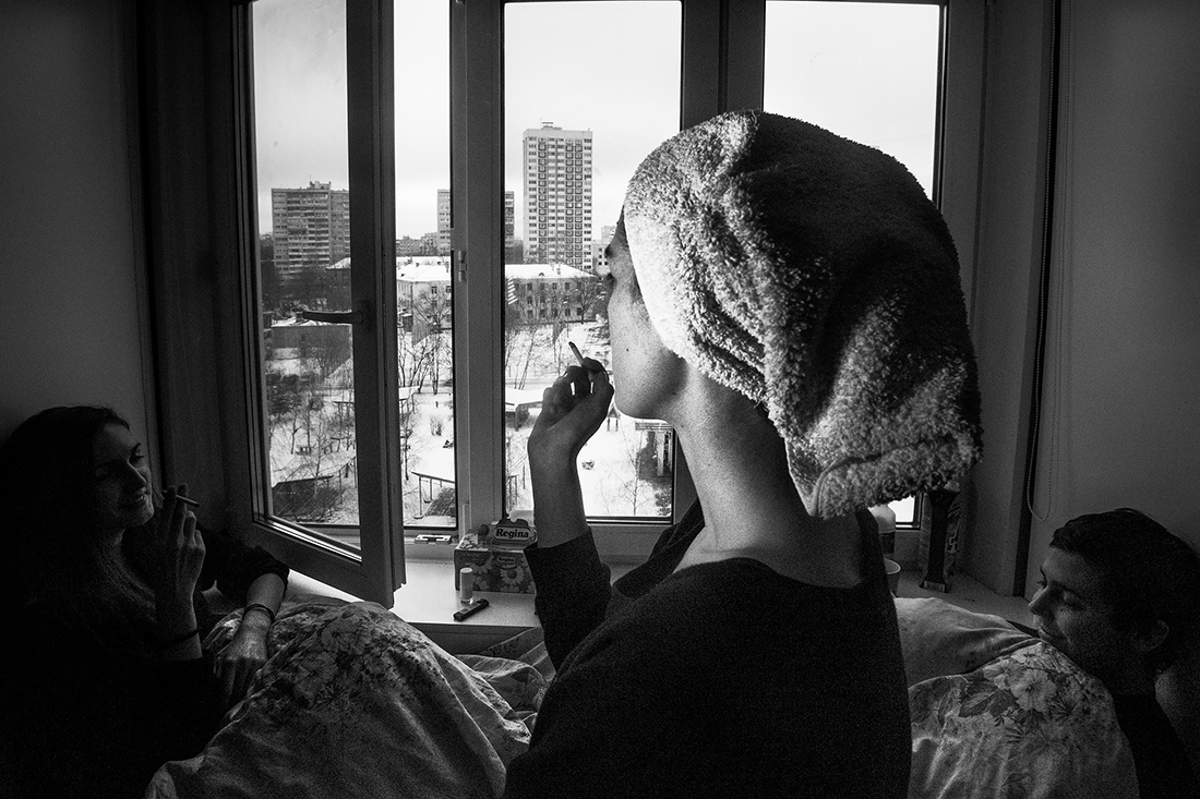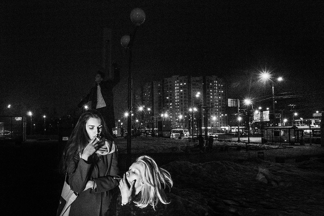 Veber hat zunächst viel mit Video gearbeitet und sich auf diesem Weg erst nach und nach an das stillstehende Bild herangetastet. Dieses ist bei ihm oft so großartig komponiert, dass die Banalität der Szenerie vollkommen hinter der Macht von Grafik und Erzählung zurücktritt. So scheinen bei ihm drei einander nackt umarmende Mädchen unter ihrer Bettdecke wie in einer Wolke zu schweben, der Arm eines Pelzmantels schiebt sich molluskenhaft ins Bild, um am anderen Bildrand eine Flasche aus einer Manteltasche zu ziehen, eine skurrille Tanzbewegung von Beinen in reflektierenden Leggings gibt dem Einschenken eines Tequilashots eine unfreiwillige Komik, und vor der Kulisse eines winterlichen Stalin-Hochhauses wirken beiläufig gehaltene Zigaretten wie in die Oberfläche des Fotos eingeschnittene Riefen – bildbestimmend. Alles ist dabei durchtränkt von heftigem Gefühl, von Träumerei, von Sexualität (soll man es hier Begehren nennen?), und auch von Rohheit und – unterschwelliger – Brutalität. Zärtlichkeit jedenfalls begegnet einem auf diesem Bildern nur in Momenten der Erschöpfung – oder, vielleicht, der Trance.