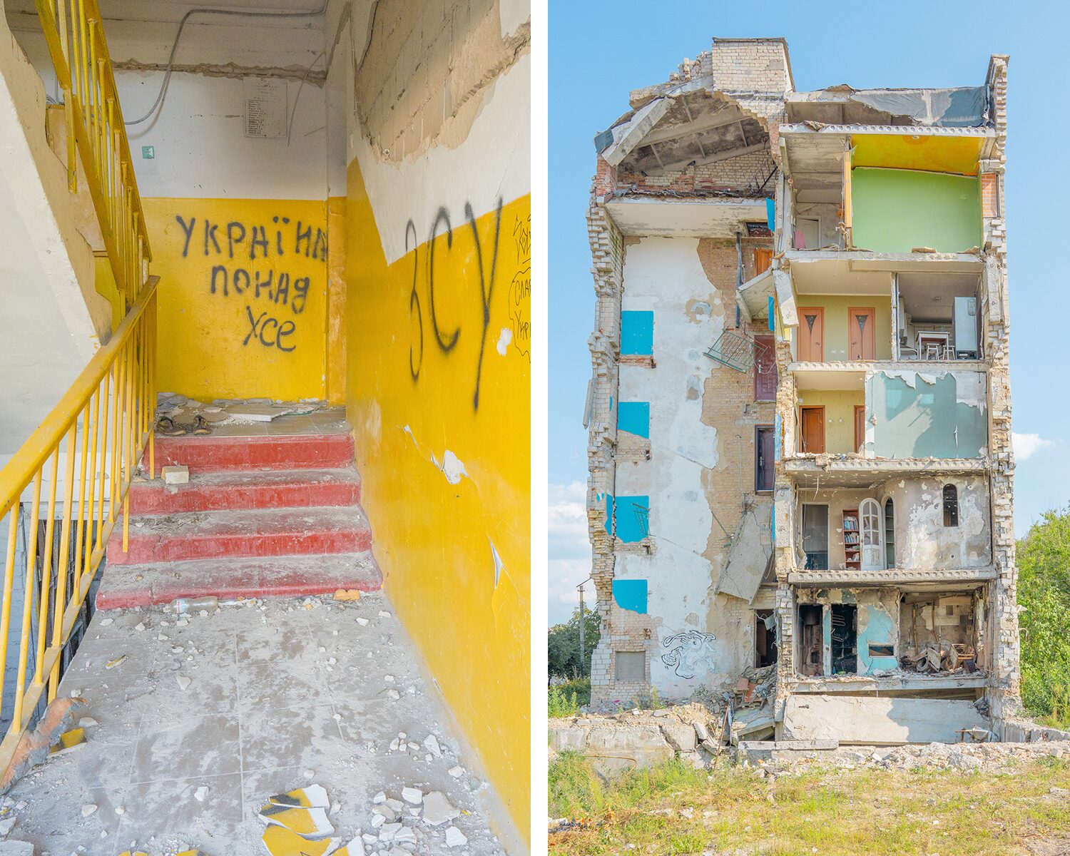 Oksana Nevmerzhitska: Ich hatte eigentlich gar nicht geplant, vom Krieg zerstörte Gebäude zu fotografieren. Ich bin keine Kriegsfotografin und arbeite nicht dokumentarisch. Außerdem sind schon so viele Bilder von Zerstörung und Ruinen aus diesem Krieg um die Welt gegangen. Mir schien, dass zu diesem Thema bereits alles gezeigt wurde und alles gesagt ist. Aber dieses Haus hat mich auf besondere Weise berührt. Es steht etwa 60 Kilometer außerhalb von Kyjiw in Borodjanka. Dort sind in den ersten Wochen des Krieges fürchterliche Dinge geschehen. Der Stadtteil, in dem das Haus steht, wurde völlig zerstört. Ich kenne das Gebäude gut, weil ich seit 20 Jahren immer wieder daran vorbeifahre, wenn ich meine Eltern besuche. Seit das Haus eine Ruine ist, lässt es mir keine Ruhe. Jedes Mal, wenn wir daran vorbeikamen, hat sich mir innerlich alles verkrampft. An einem schönen Sommertag im August 2023 habe ich schließlich meinen Mann gebeten anzuhalten. Meine Familie hat im Auto gewartet und ich bin losgezogen und habe diese Bilder gemacht.