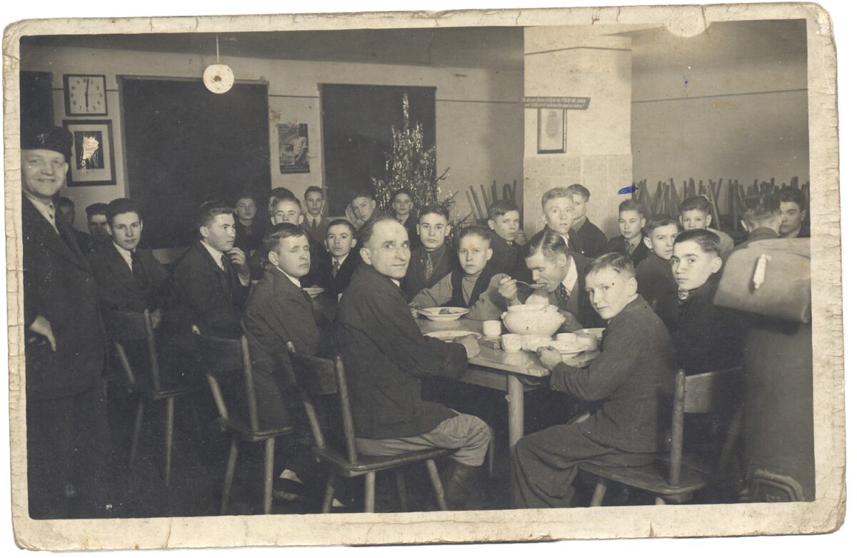 Auf diesem gestellten Foto sind fast alle sitzenden Männer dem Fotografen zugewandt, die Menschen im Vordergrund schauen ins Objektiv, einer von ihnen isst. Während der Feiertage wurden in Kantinen oder anderen Gemeinschaftsräumen fast überall geschmückte Weihnachtsbäume aufgestellt – auch für Propagandafotos.