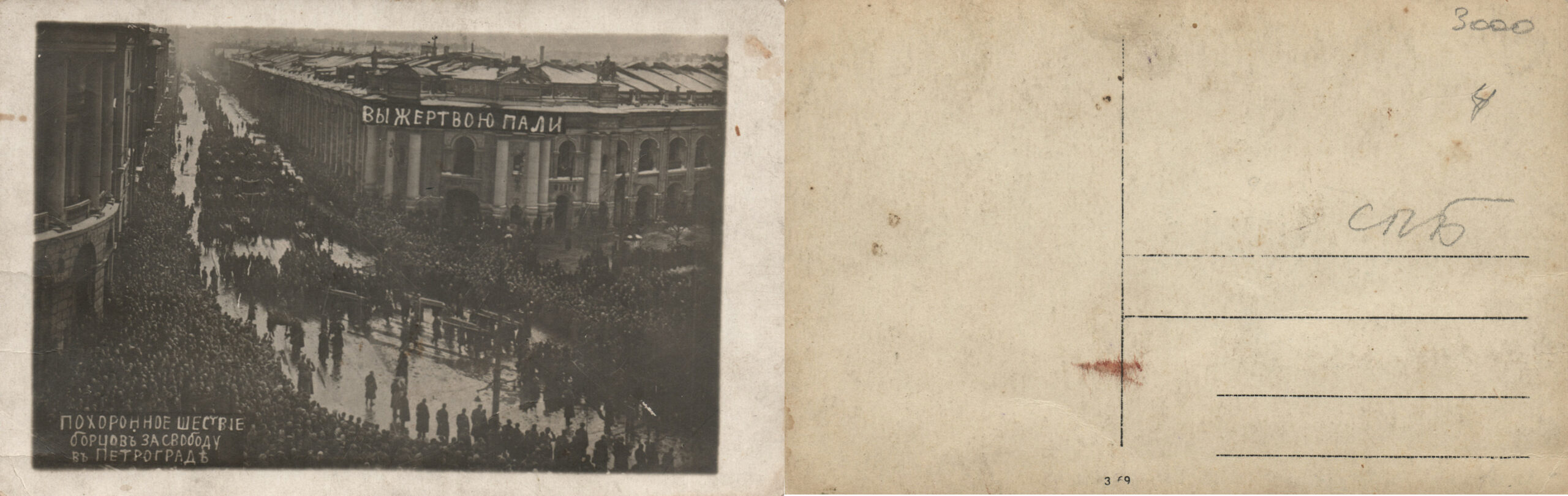 Im März dokumentierten Postkarten die Toten und vor allem Prozessionen, welche die Form politischer Kundgebungen annahmen und die Särge zu feierlichen Begräbnissen in Gemeinschaftsgräbern auf dem Marsfeld begleiteten. Im Juli zirkulierten Postkarten mit Begräbnisprozessionen der im Zuge der bolschewistischen Juliaufstandes getöteten Kosaken mit ihren Pferden, und im November solche der (weniger zahlreichen) Opfer der Oktoberrevolution.
