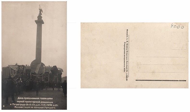 Bemerkenswert ist die Tatsache, dass es zum Staatsstreich im Oktober keine dokumentierende Postkarte gibt. Die Oktoberrevolution bleibt zunächst in der visuellen Kultur eine Leerstelle. Die Bolschewiki inszenierten ihren Staatsstreich als Gründungsmythos, der aber erst anhand der Prozessionen zum ersten Jahrestag der Revolution 1918 sichtbar wird.6
