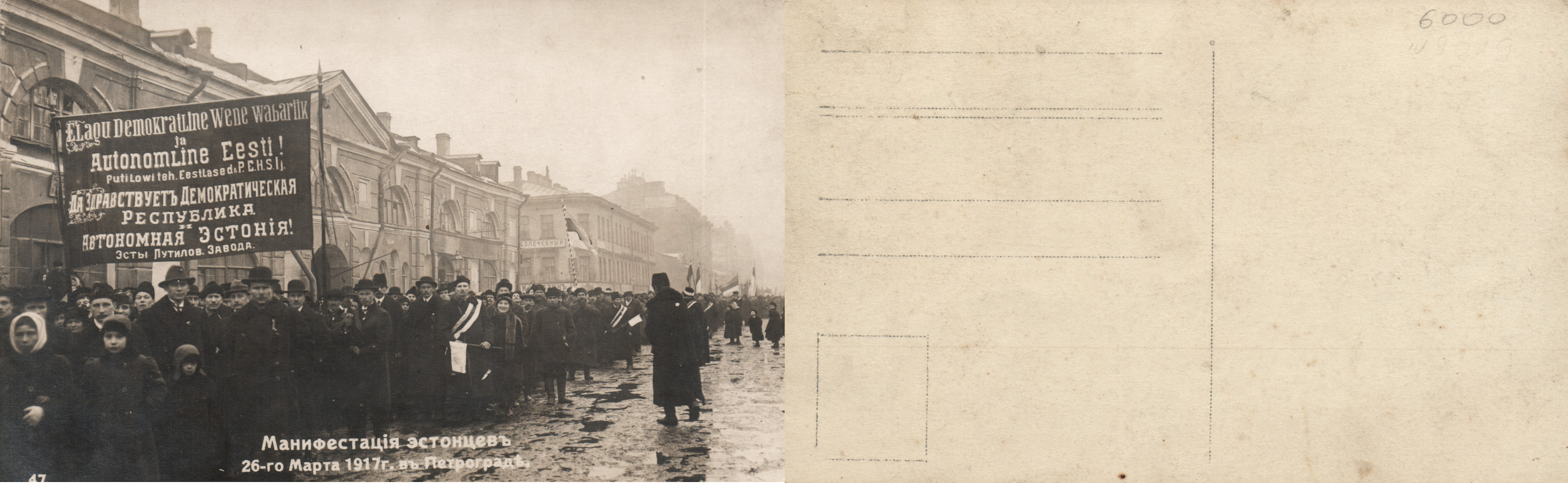 Andere Karten zeigen politische Demonstrationen, etwa für die Rechte der Frauen oder die Unabhängigkeit Estlands. Auf den Bannern stehen als häufigste Losungen: „Es lebe die demokratische Republik!“, „Es lebe die Internationale!“ oder „Es lebe der Sozialismus“.