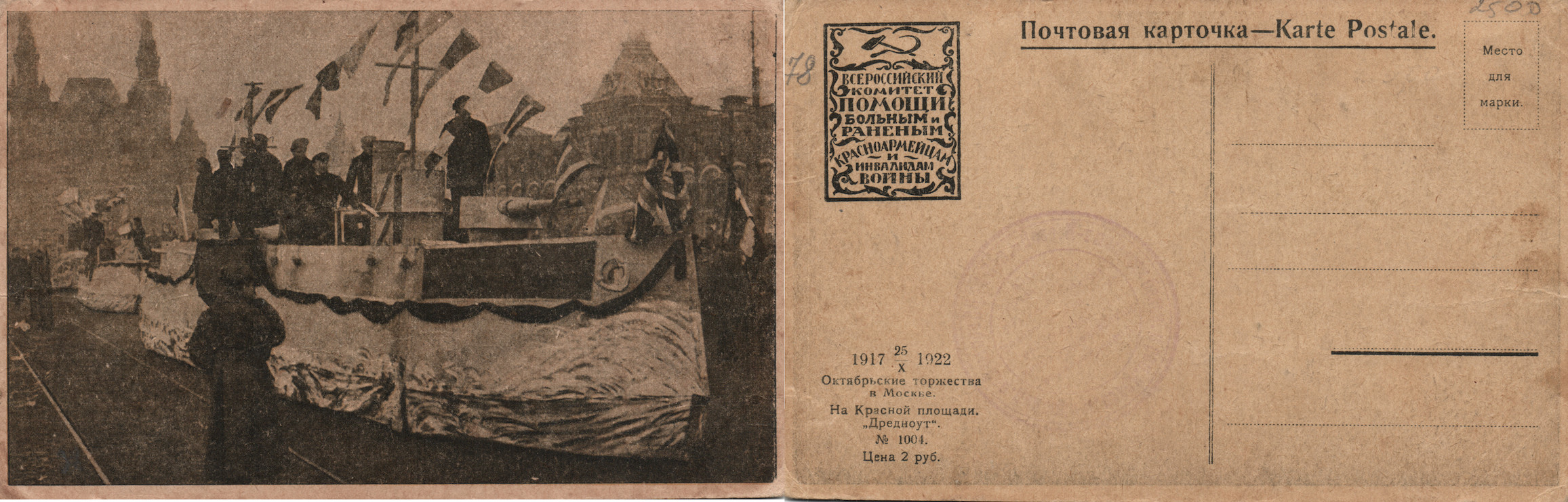 Feiern des fünften Jahrestages der Oktoberrevolution 1922 auf dem Roten Platz in Moskau. Für die Parade werden „Dreadnought“-Schiffe der Marine nachgebaut, um die sowjetische Flotte zu repräsentieren. Der Aufdruck auf der Adress-Seite offenbart den wohltätigen Zweck der Postkarte: Sie dient dem Allrussischen Hilfs-Komitee für Kranke und Verletze der Roten Armee und der Kriegsinvaliden. Damit läuft der Zweck der Karte dem heroischen Narrativ auf der Vorderseite entgegen: Es tut sich ein Riss auf zwischen den heroischen Soldaten auf ihren Artillerieschiff-Attrappen während der Parade und der ernüchternden Realität des Kriegselends.