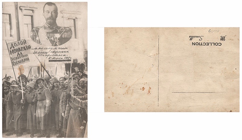 Viele Postkarten haben eine satirische Funktion. Auf dieser Postkarte wird die Monarchie verspottet. Im Luftraum über einer Schar Soldaten schwebt das hineinmontierte Konterfei des letzten Zaren Nikolaus II.. Ein Soldat hält ein ebenfalls nachträglich hineinmontiertes Banner mit der Aufschrift: „Weg mit der Monarchie, es lebe die Revolution!“, während der Zar „zum Wohle der Menschheit auf den Thron verzichtet“. Die Karte wurde von einem vermutlich belgischen Verlag Somville herausgegeben.