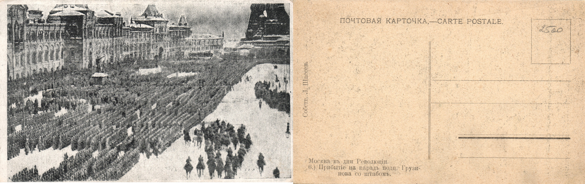 Revolutionäre Ereignisse erschüttern nicht nur Petrograd, sondern auch Moskau. Zum gewöhnlichen Postkartenmotiv der Serie „Moskau in den Tagen der Revolution“ werden abgebrannte und zerstörte Gebäude sowie die Parade auf dem Roten Platz. Diese Postkarte zeigt die „Ankunft [General] Grusinows mit seinem Stab bei der Parade“.