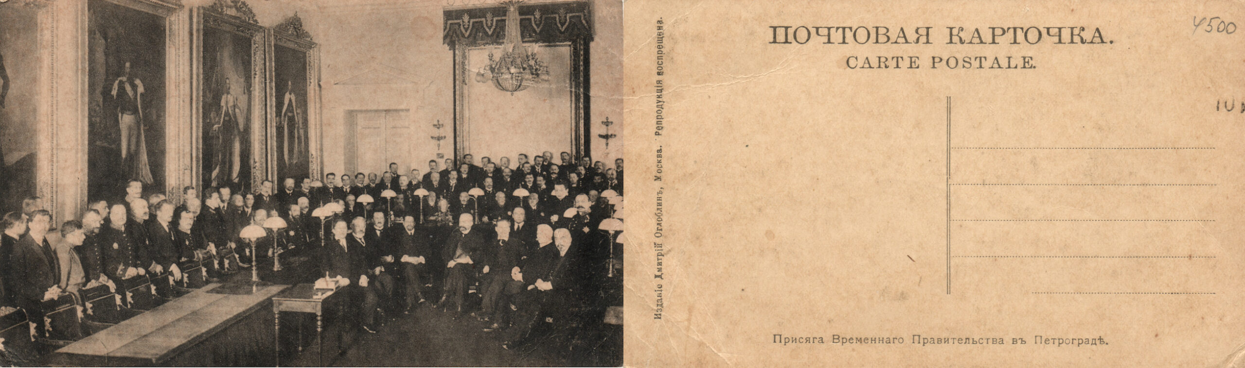Die Provisorische Regierung stellte den revolutionären Narrativen ihre eigene Deutung der Ereignisse gegenüber. Sie war aber in sich zerstritten und hatte keine konsistente Kultur- und Pressepolitik. 1917 erschienen dennoch mehrere Postkarten mit Porträts der Regierungsmitglieder. Bald konzentrierten sich die Postkartenhersteller auf die charismatische Persönlichkeit Kerenskis. Glaubt man den zeitgenössischen Postkarten, wandelte sich sein öffentliches Image vom verehrten Staatsmann über den volksnahen Kriegsminister in einfacher Soldatenuniform hin zum arroganten, von seiner Macht korrumpierten Politiker, der die Privilegien des Palastlebens genoss.5
