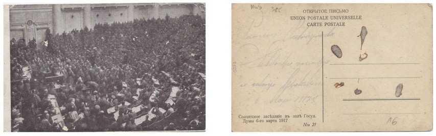 Die Postkarten mit bewegten Massen suggerieren die tiefe Verwurzelung des Sowjets in der Bevölkerung, Schwung und Tatkraft. Zugleich wird hier die Aneignung eines alten Ortes der Macht (Parlament) durch die neue Bewegung symbolisch ins Bild gesetzt – der Sowjet tagte in einem Flügel des Taurischen Palais, die Provisorische Regierung im anderen.