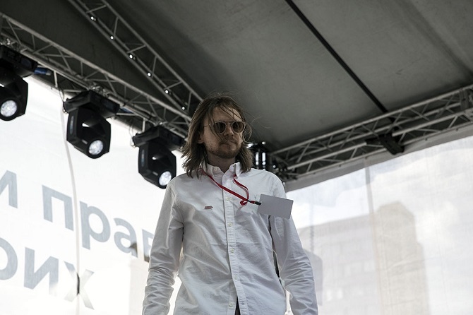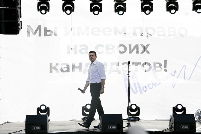 Ilja Jaschin während seines Auftritts. Auch ihm wurde die Registrierung verweigert. Im Hintergrund zu lesen: „Wir haben das Recht auf eigene Kandidaten“ / Foto © Wlad Dokschin