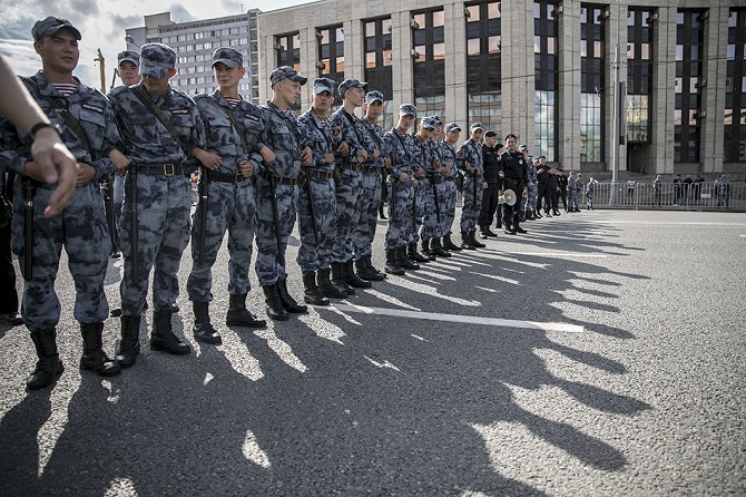 Angehörige der Russischen Nationalgarde drängen die nach der Demo Gebliebenen auf dem Sacharow-Prospekt zurück. Insgesamt wurden bei der Protestaktion sechs Menschen verhaftet / Foto © Wlad Dokschin