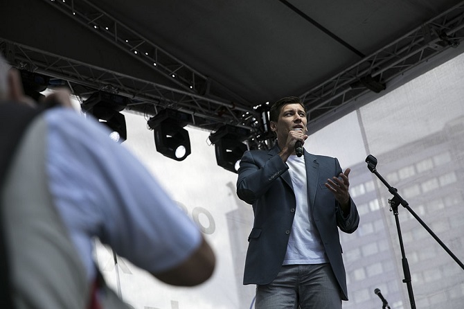 Rede des Politikers Dimitri Gudkow. Er wurde von der Wahl ausgeschlossen, weil er nach Angaben der Wahlkommission die gestatteten zehn Prozent „Ausschuss“ an Unterstützer-Unterschriften überschritten hat / Foto © Wlad Dokschin
