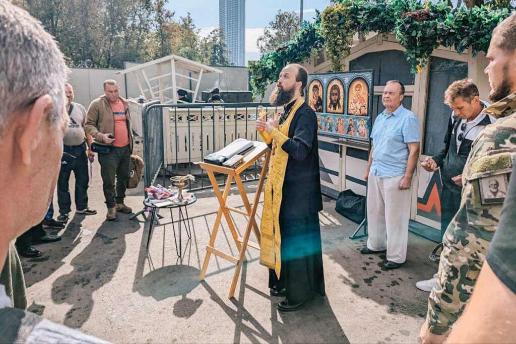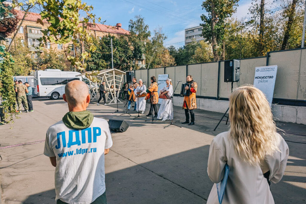 Als wir mit einem der Anwärter sprechen, spielen nebenan Musikerinnen Akkordeon und Zither. Sie sind in reich verzierte Kaftane gekleidet und tragen Kokoschniks mit künstlichen Perlen auf den Köpfen. Es ist eine der Kulturbrigaden von Moskonzert, die „sich an der Unterstützung der Streitkräfte Russlands und des Staates beteiligt“.
