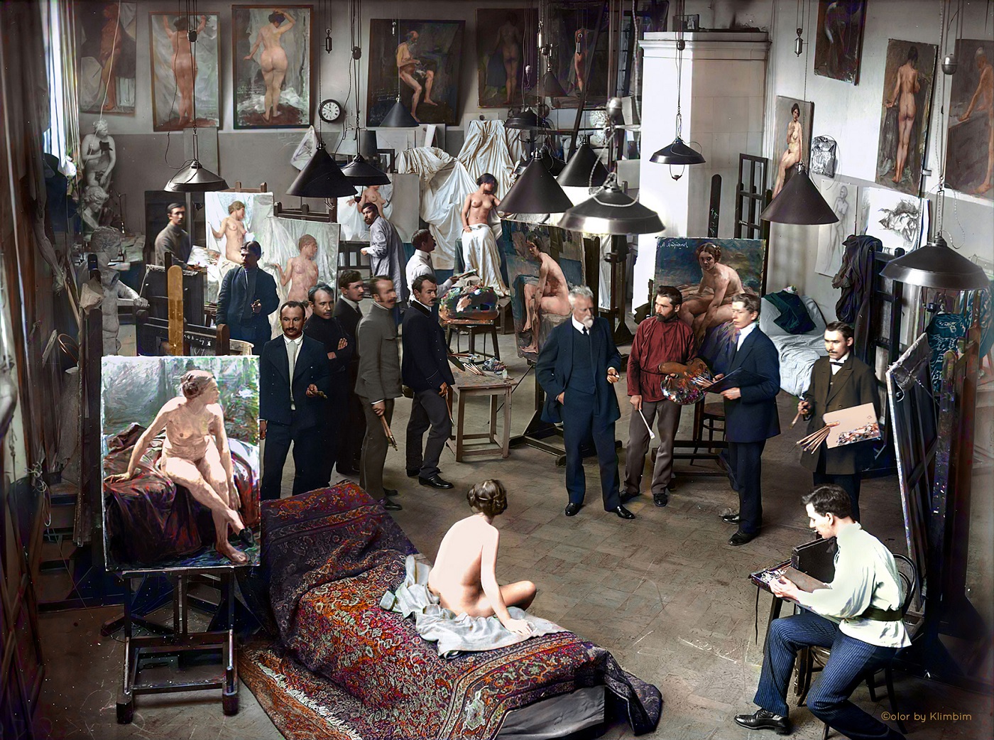 Professor Wladimir Makowski im Malerei-Atelier der russischen Akademie der Künste, Sankt Petersburg, 1913