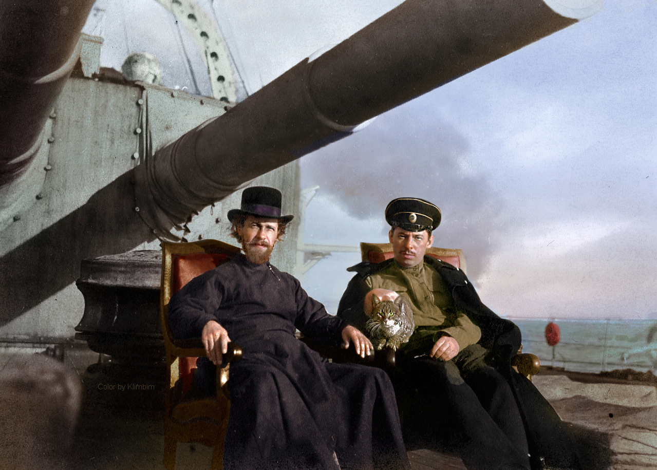 Priester Solodkow, der Schiffsarzt und die Katze an Deck der Kagul in Bizerta (Tunesien), 1921