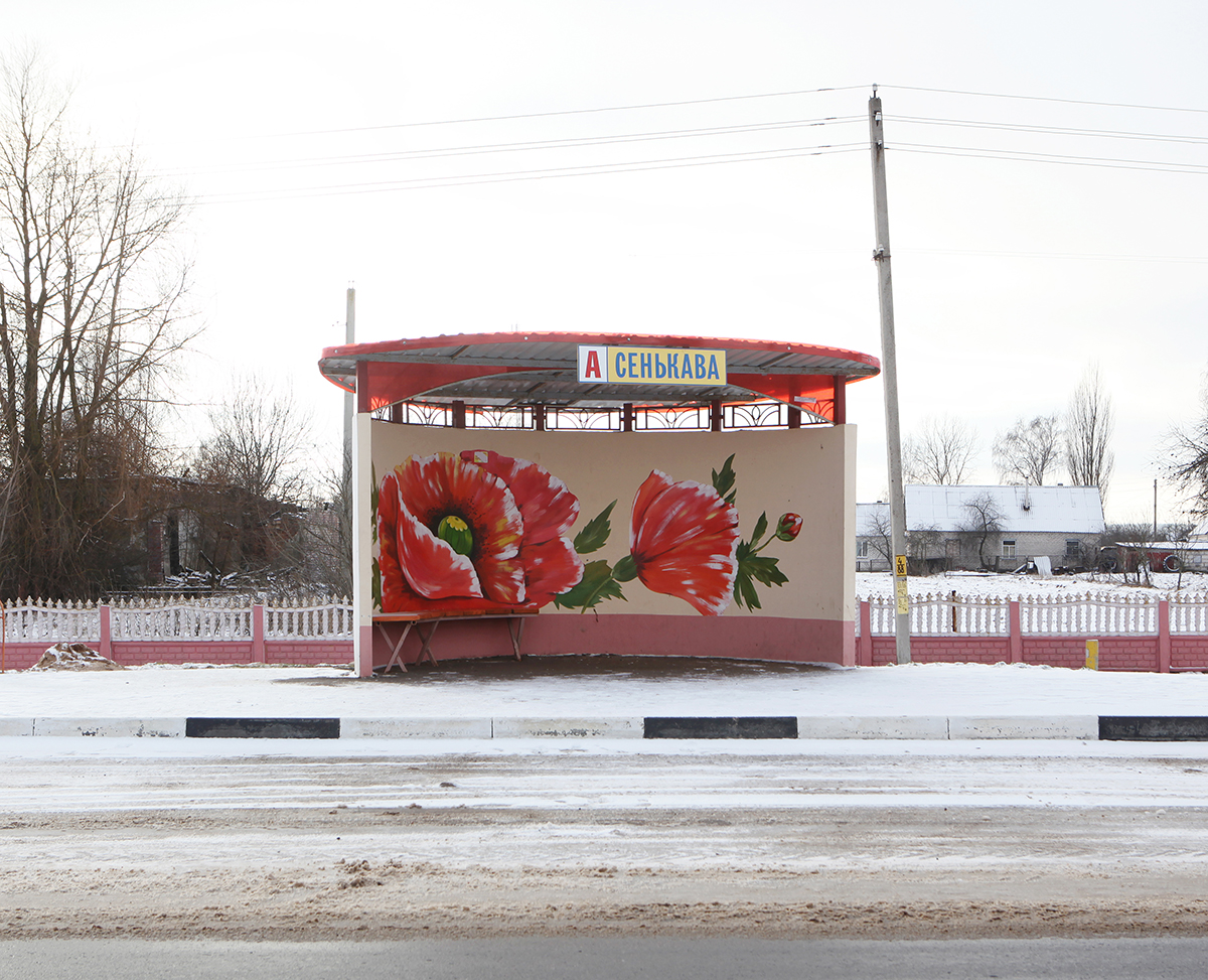 Wie ich später herausfand, stammten einige Malereien noch aus den 1980er Jahren, sie blieben an den alten Haltestellen erhalten – die waren aus Beton. Im Umland von Minsk und anderen großen Städten sind diese Haltestellen schon vor langer Zeit gegen moderne Varianten aus Metall oder Kunststoff ausgetauscht worden. Die Blumen- und Tiermotive, die mich interessieren, findet man eher in der Peripherie von Belarus, sodass ich einige Zeit im Auto verbringen musste – aber das hat mir Spaß gemacht.