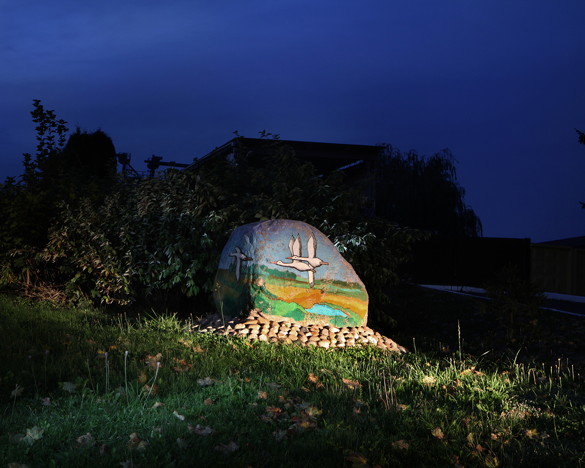 Aus fotografischer Sicht war It must be beautiful ein unkompliziertes Projekt. Die Aufnahmen sind maximal ruhig, klassische Landschaft mit einem Objekt darin. Ich verwende ein mittleres Format, eine große Kamera, mit der man nicht schnell fotografieren kann und die dazu einlädt, das Bild aufmerksam zu betrachten. In den meisten Fällen fügen sich die Malereien an den Haltestellen oder Findlingen scheinbar fließend in die umgebende Landschaft ein, werden ein Teil von ihr, heben sich aber gleichzeitig auch von ihr ab. Natürlich suche ich solche Wechselbeziehungen, doch wichtiger für mich ist das Phänomen festzuhalten, da in der heutigen Zeit solche Dinge sehr schnell und unbemerkt verschwinden können.