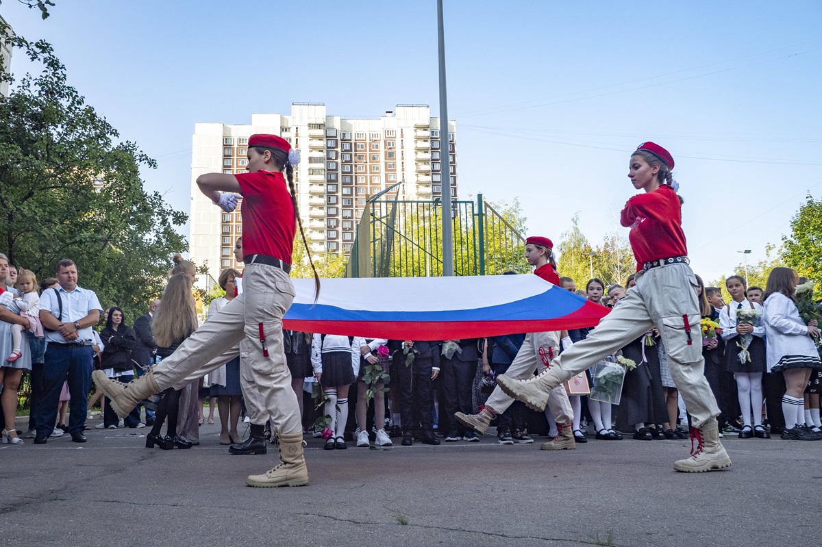 Die am weitesten verbreitete Form der Arbeit der Bewegung der Ersten sind Aktionen, die anlässlich staatlicher Feiertage durchgeführt werden. Hier: Hissen der russischen Flagge am Tag des Wissens in Moskau, im September 2023 / Foto © Konstantin Kokoshkin/IMAGO, Russian Look