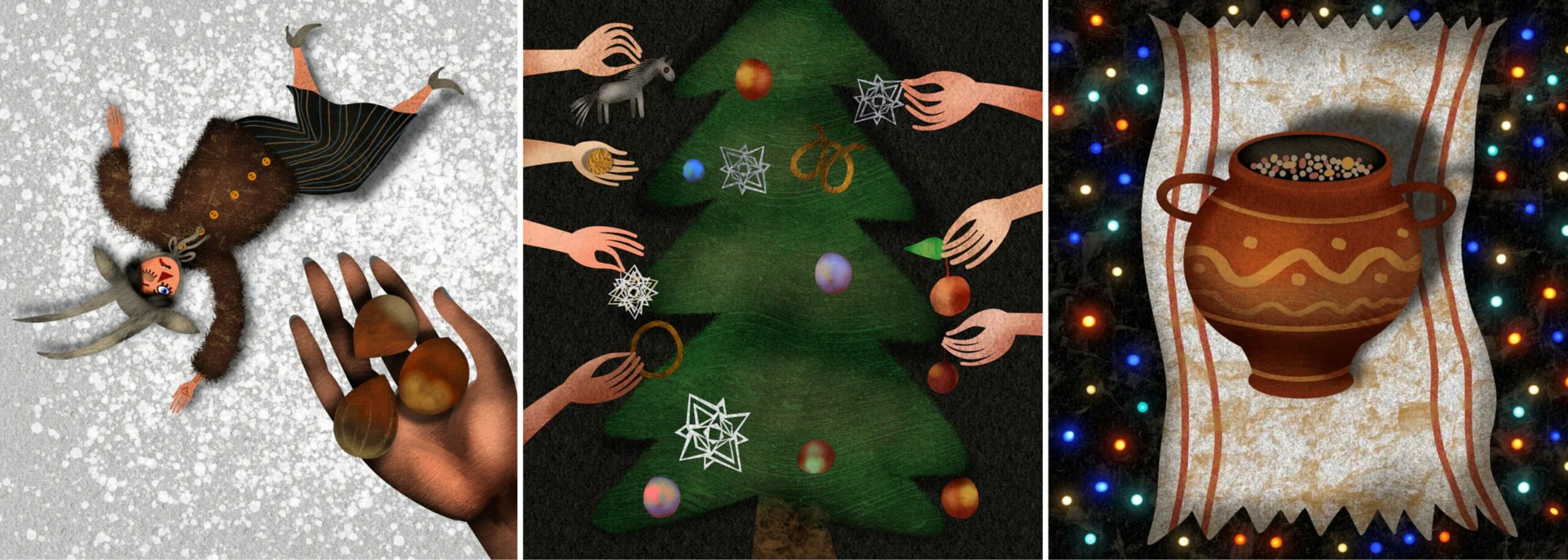 Es gibt eine interessante Überlieferung, woher die Tradition mit dem Tannenbaum stammt: „Als Jesus Christus geboren wurde, brachten alle Geschenke, doch der Bär wusste nicht, was er mitbringen sollte, also riss er eine Tanne aus. An einer Stelle ging er durchs Wasser, stolperte, das Wasser gefror und da waren am Baum plötzlich allerlei Eisfiguren. Der kleine Herr Jesus betrachtete sie begeistert und freute sich. Das war das beste Geschenk! Seitdem gibt es den geschmückten Weihnachtsbaum.“