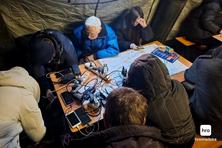 Viktorija erzählt: „Wenn wir wenigstens ausreichend Strom hätten, könnten wir Elektroheizungen anschließen. Doch um einen Generator selbst zu kaufen, bräuchten wir 600 000 Hrywnja [ca. 12 500 Euro], mit Anschluss über eine Million. Als Bewohner können wir das nicht stemmen. Deshalb bitten wir die Stadt und die Regierung: Helft uns. Wir wissen, dass für andere Häuser solche Generatoren bereitgestellt wurden. Außerdem bitten wir um einen zusätzlichen Punkt Neslamnosti [dt. Punkt der Unbezwingbarkeit, gemeint ist ein Wärmezelt]. In der Nähe gibt es schon zwei Zelte, doch da muss man Schlange stehen. Ich habe heute einen halben Tag dort verbracht, mein Telefon zu laden. Sie können sich das gerne ansehen, dort sind alle Steckdosen mit Verlängerungskabeln belegt, in denen jeweils wieder Verteiler stecken und darin Powerbanks, an denen mehrere Telefone laden.“
