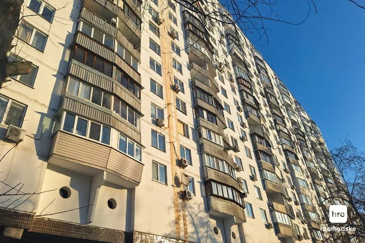 Wir stehen vor dem Gebäude. Mehrere Bewohner erzählen ausführlich, wie sie versuchten, das Haus zu retten. Am 20. Januar explodierte nur hundert Meter von hier eine Shahed-Drone. Durch die Druckwelle flogen im Haus Scheiben aus den Fenstern und die Temperatur sank in diesen Wohnungen auf -10 °C. Den ganzen Tag lang dichteten die Bewohner die Fenster notdürftig mit OSB-Platten ab. Doch in einem der oberen Stockwerke platzte ein Rohr in der Außenwand und das Wasser ergoss sich an der Außenseite des Hauses. Nun zieht sich eine schmutzige Spur voller Eiszapfen über die Klimaanlagen hinunter, die von Zeit zu Zeit abfallen.