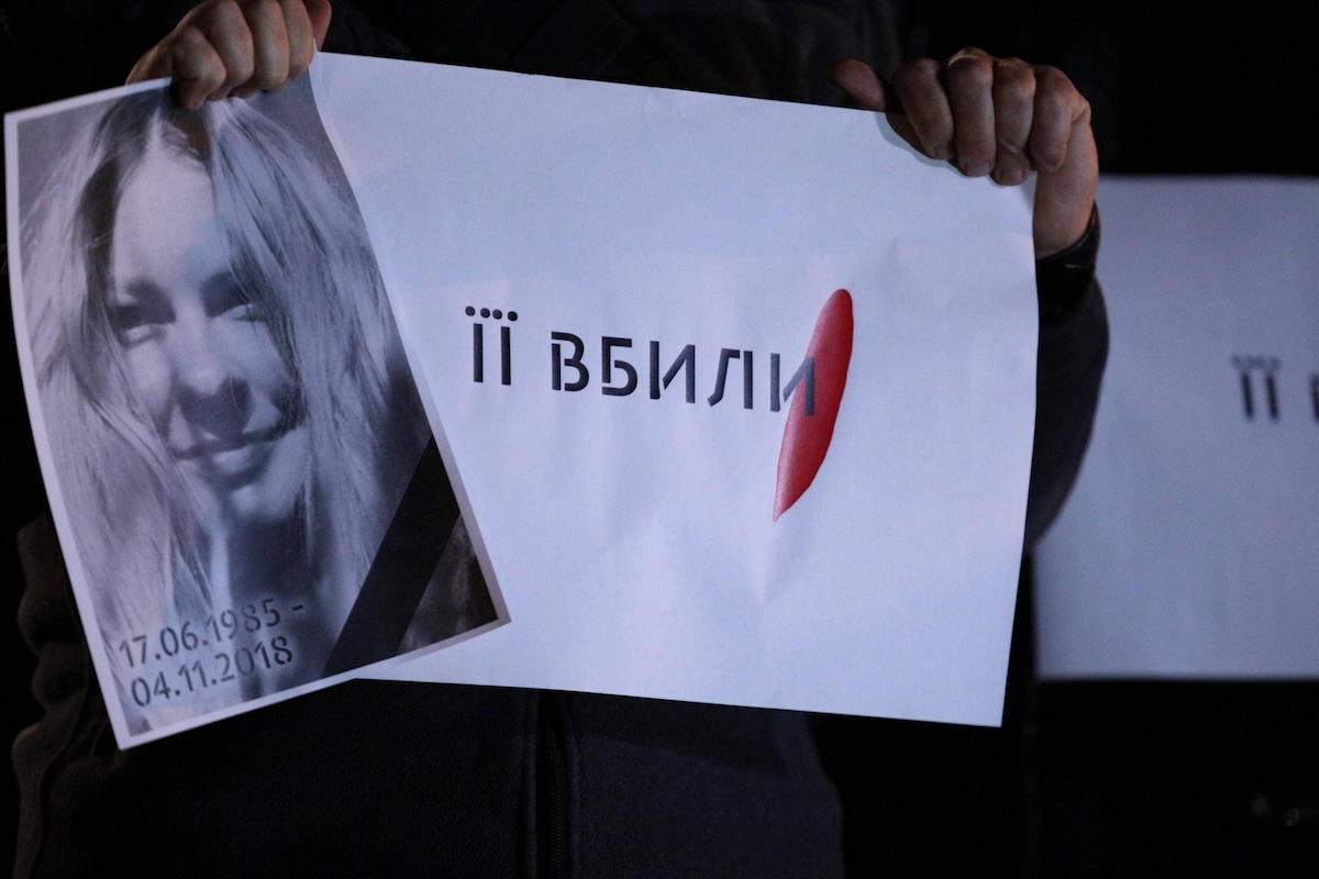 „Sie wurde ermordet“: Kundgebung vor dem Innenministerium in Kyjiw am 4. November 2018. An diesem Tag ist Kateryna Handsjuk den Verbrennungen durch einen Säure-Anschlag am 31. Juli 2018 in Cherson in einem Kyjiwer Krankenhaus erlegen. / © Danil Shamkin/ IMAGO / Ukrinform