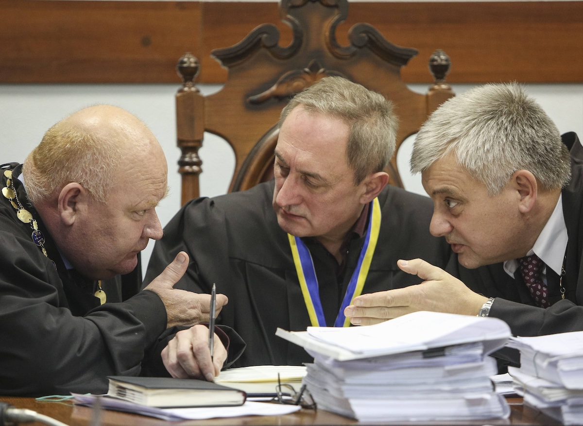 Richter beraten sich im Handsjuk-Prozess gegen Wladyslaw Manher 2019 in Kyjiw.  / © Sergii Kharchenko / IMAGO / Ukrinform
