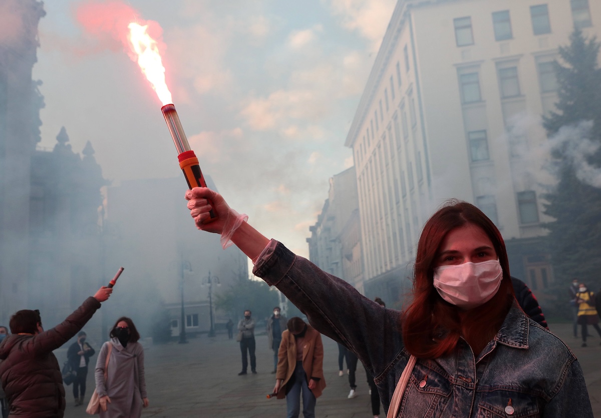 Aktion zum Gedenken an Kateryna Handsjuk vor dem Präsidialamt in Kyjiw  im April 2020 / ©  Henadii Minchenko / IMAGO / Ukrinform
