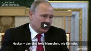 1. Juni 2017. Beim Petersburger Wirtschaftsforum antwortet Präsident Wladimir Putin auf die Frage von dpa-Chef Peter Kropsch, ob er es für möglich hält, dass russische Hacker erbeutete Daten oder Falschinformationen im Bundestagswahlkampf verbreiten. Sie sehen…
